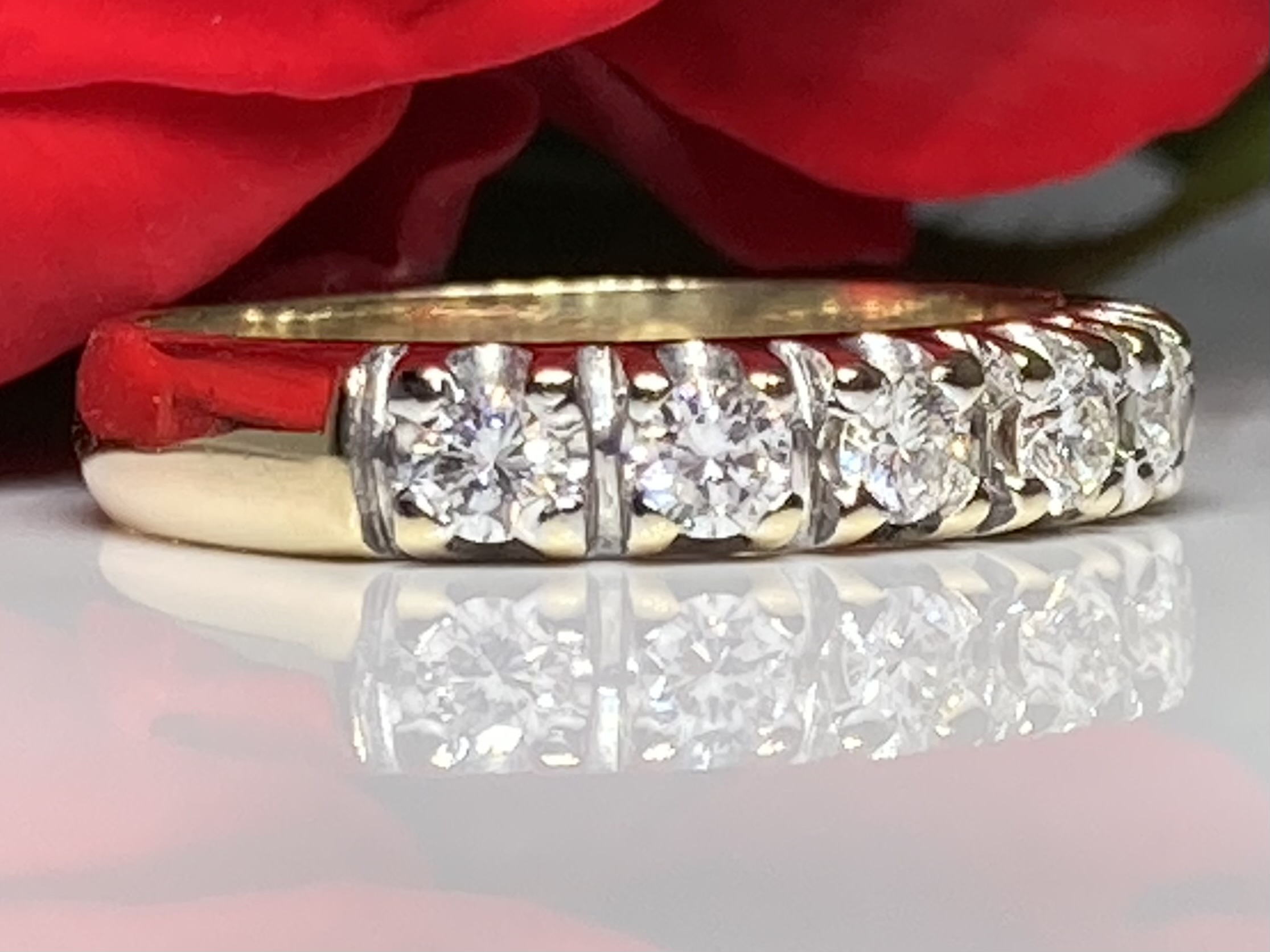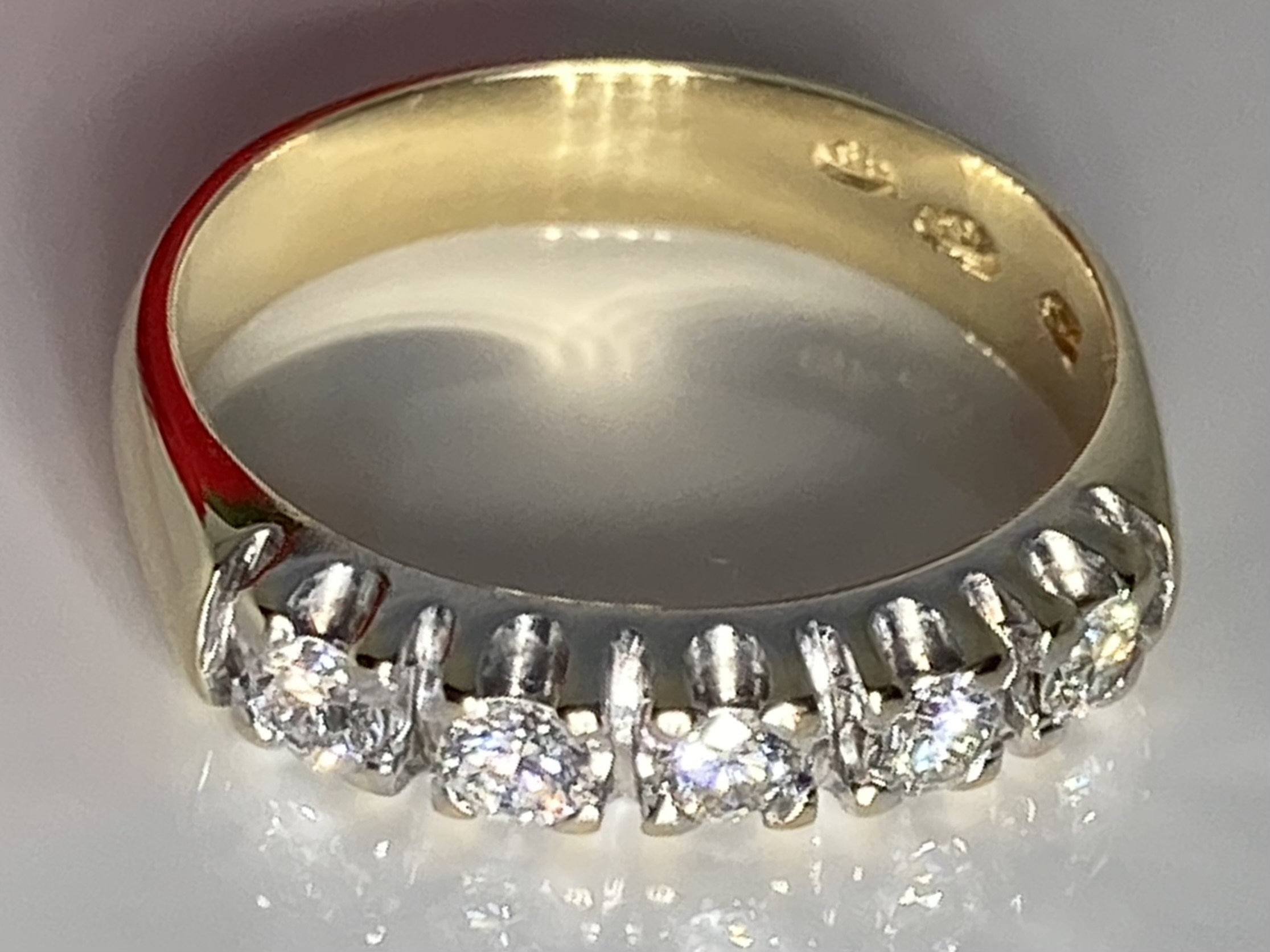 For sale: a beautiful and refined 14k yellow gold (585) diamond ring featuring five sparkling diamonds, each securely set in white gold for added brightness and contrast.